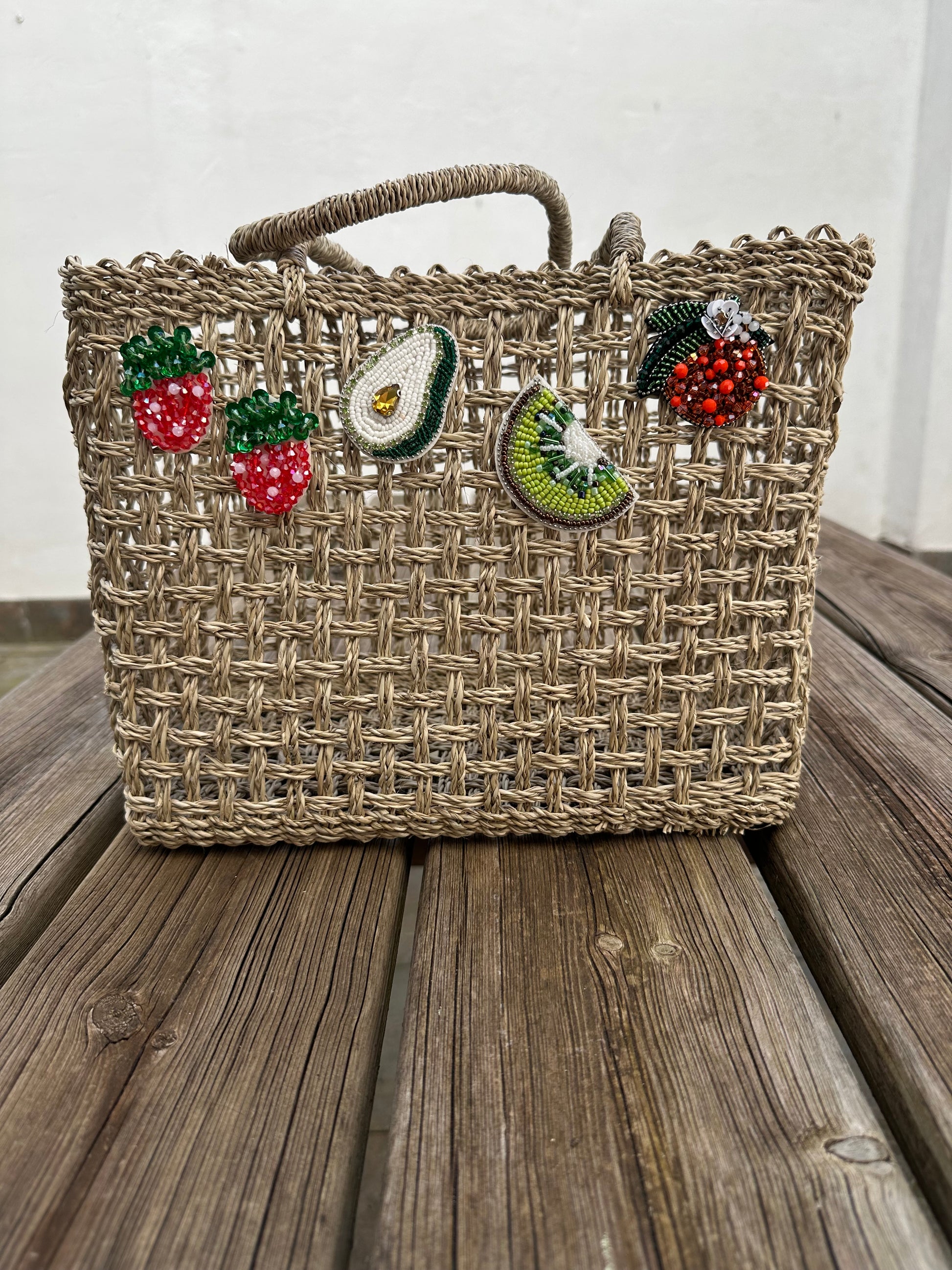 Bolso Capazo Cubo de Mano con Frutas de Predería M Natural Beige