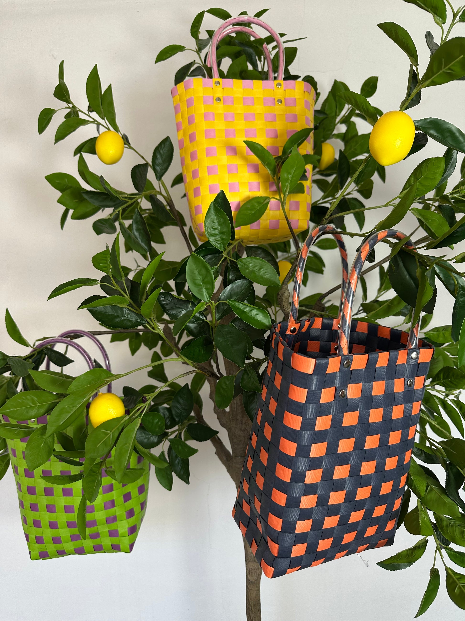 Bolso Plástico Trenzado Damero Rosa Amarillo