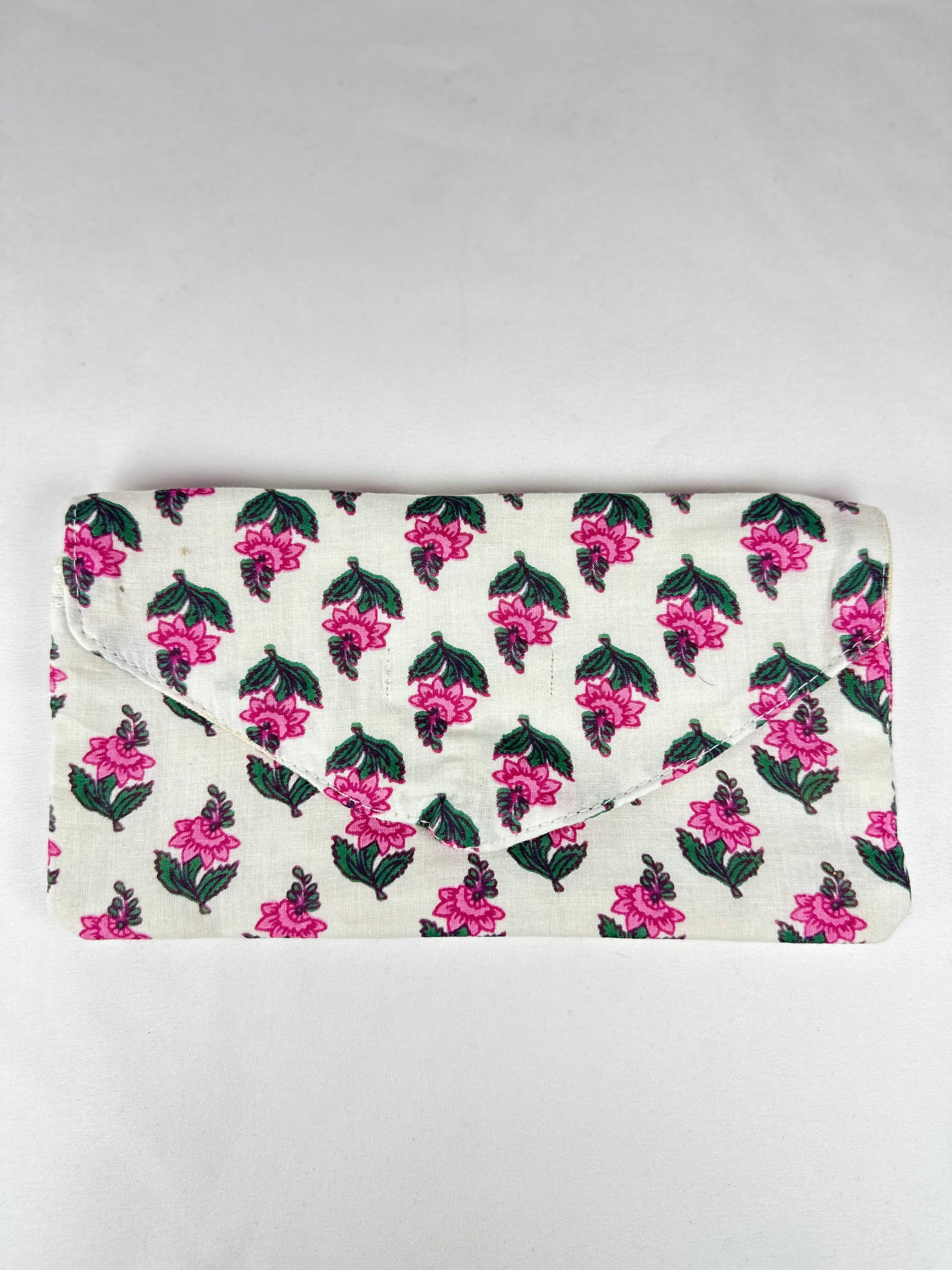 Una cartera monedero de tela india en tono blanco, adornada con delicadas flores rosas que le dan un aire fresco y femenino. Su diseño ligero y luminoso se completa con un cierre clip clásico, práctico y elegante. Un accesorio versátil y lleno de encanto, ideal para quienes buscan un detalle especial con un toque artesanal.