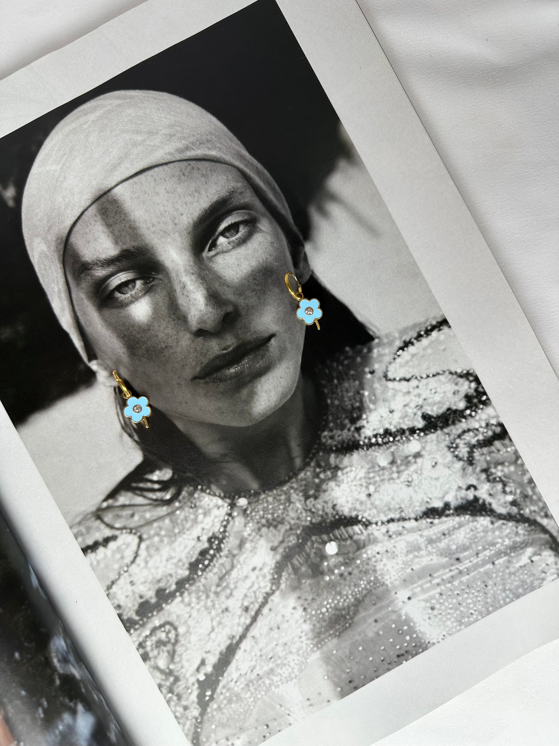 Mini pendientes con flor azul, tallo dorado y un brillante decorativo, ideales para añadir un toque suave, colorido y elegante a cualquier look. Su diseño floral aporta un aire romántico y moderno, perfecto para el día a día o para combinar en looks más especiales.