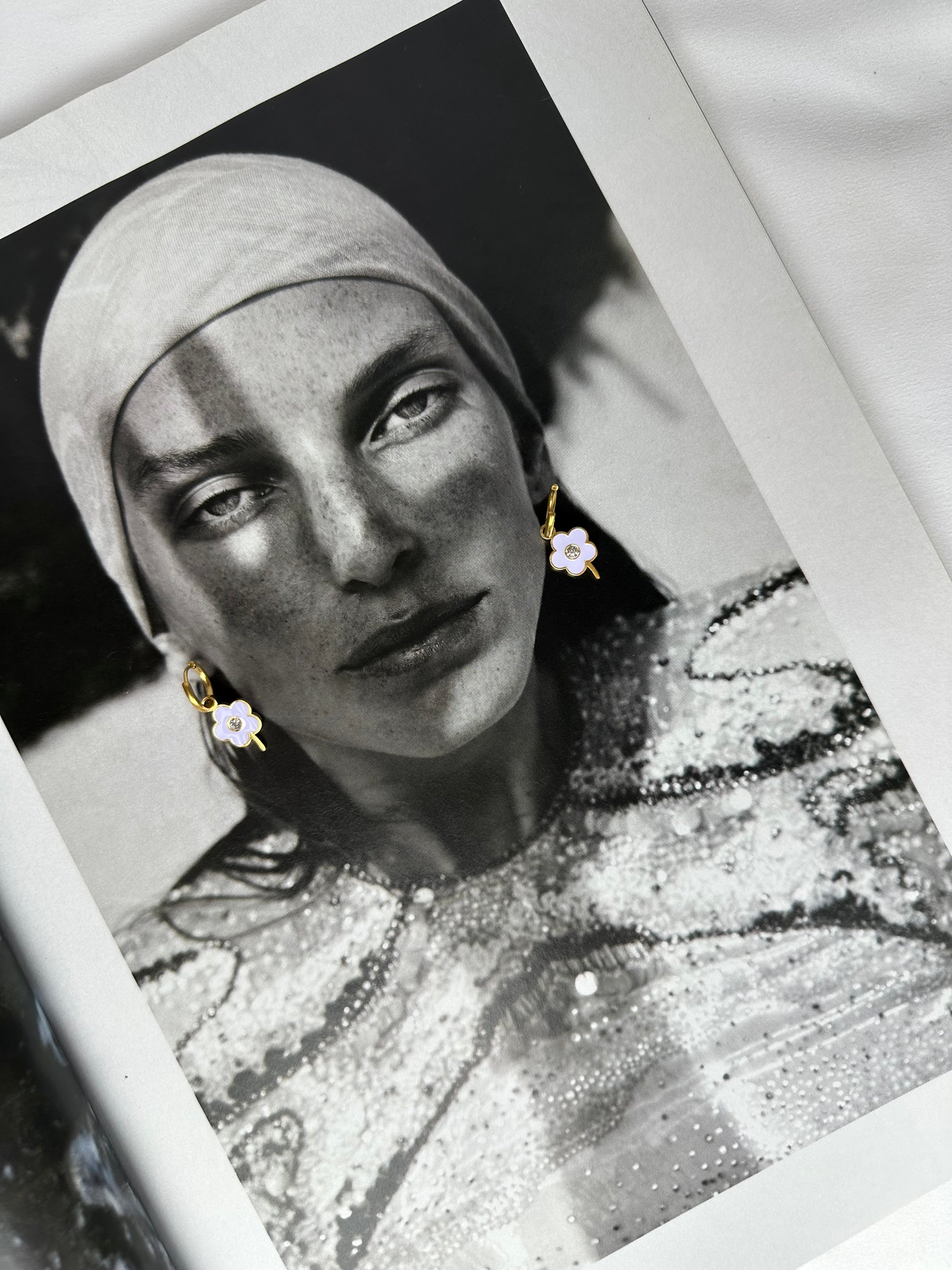 Mini pendientes con flor lila, tallo dorado y un brillante decorativo, perfectos para añadir un toque delicado y moderno a cualquier look. Su diseño floral en tonos lavanda aporta un aire romántico, fresco y luminoso, ideal para estilismos diarios o combinaciones más especiales.