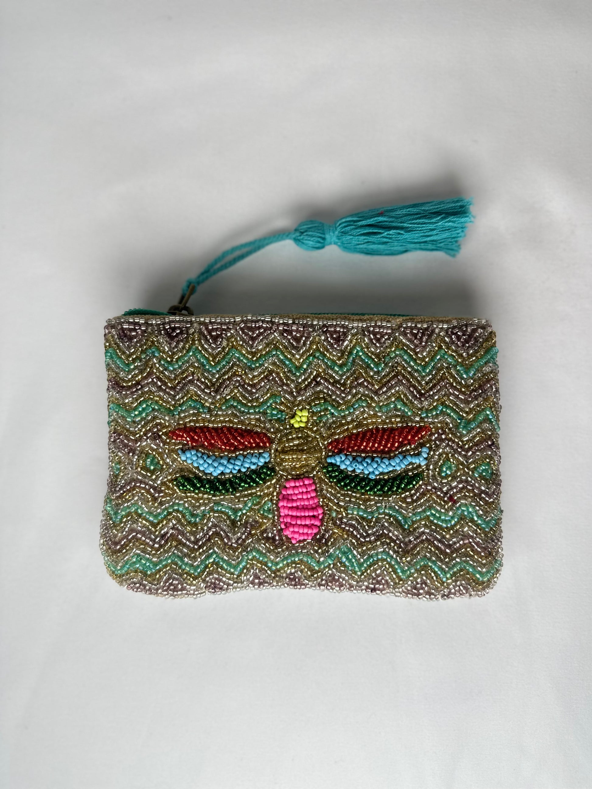 Monedero elaborado en tejido estilo alfombra y decorado con cuentas formando una libélula, acompañado de una borla azul claro que aporta un toque suave y luminoso. Su tamaño resulta perfecto para llevar monedas, llaves, tarjetas o esos pequeños imprescindibles del día a día.