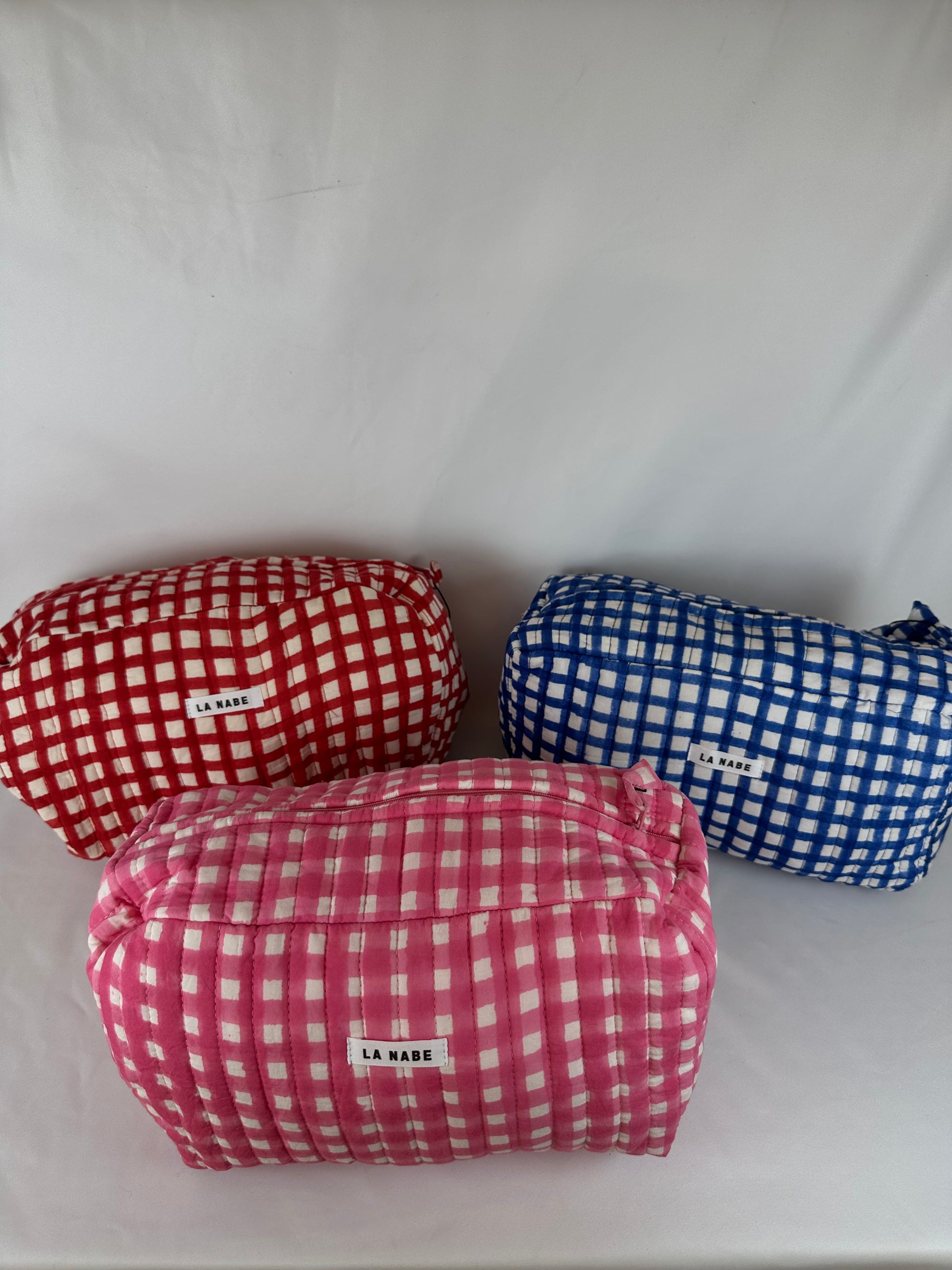 Este neceser grande con estampado de cuadros vichy en rojo y blanco es ideal para organizar tus esenciales con estilo. Su diseño atemporal evoca frescura y calidez, perfecto para acompañarte en viajes, rutinas diarias o días de playa.