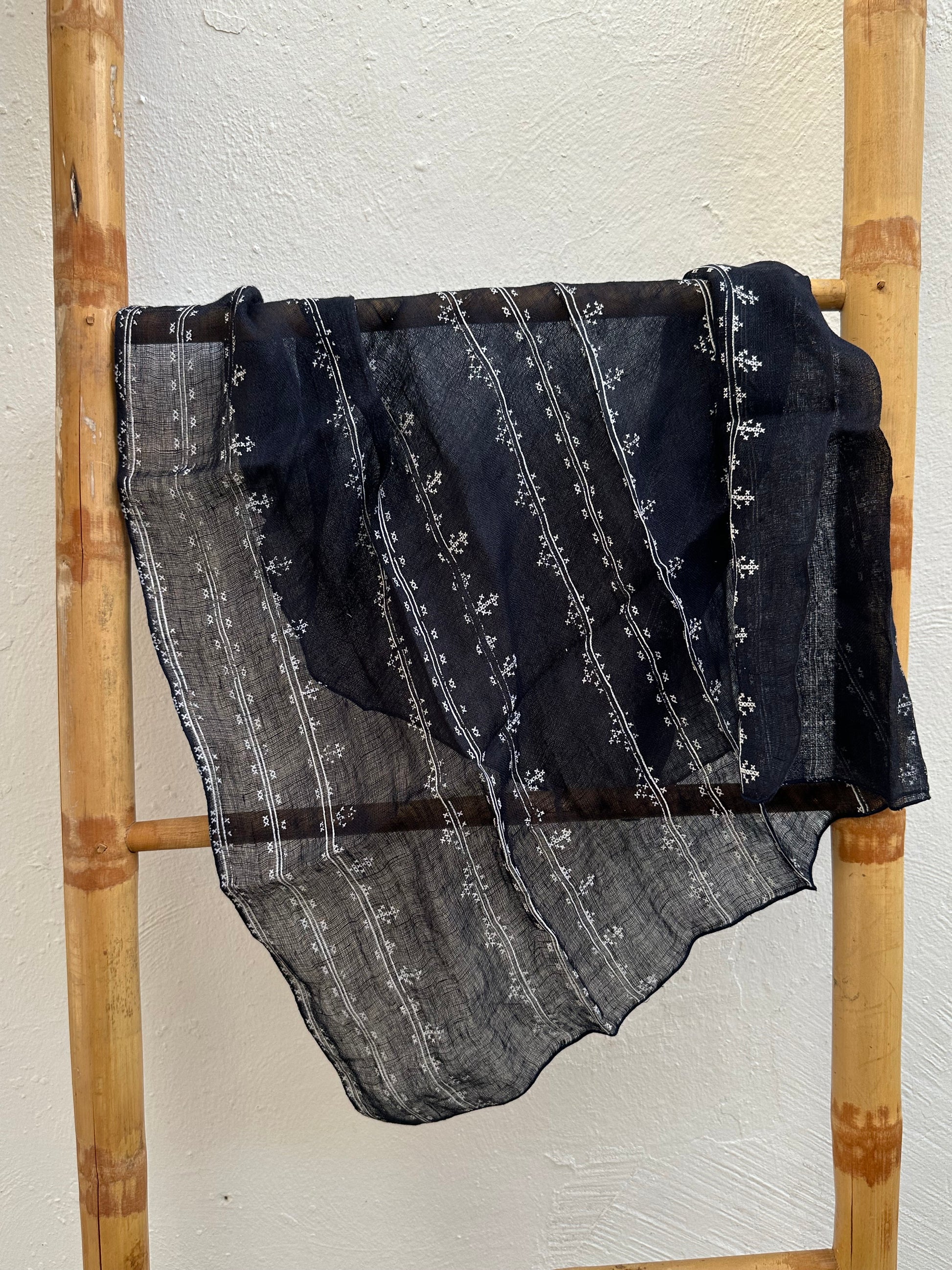 Este pañuelo de lino en tono azul marino profundo destaca por su delicado detalle similar al punto de cruz, que aporta un toque artesanal y sofisticado. Fabricado en tejido natural, ligero y transpirable, ofrece una textura suave y cómoda ideal para llevar al cuello, en el cabello o como accesorio en el bolso. Es un complemento versátil, clásico y lleno de elegancia, perfecto para realzar cualquier look con discreción y estilo..