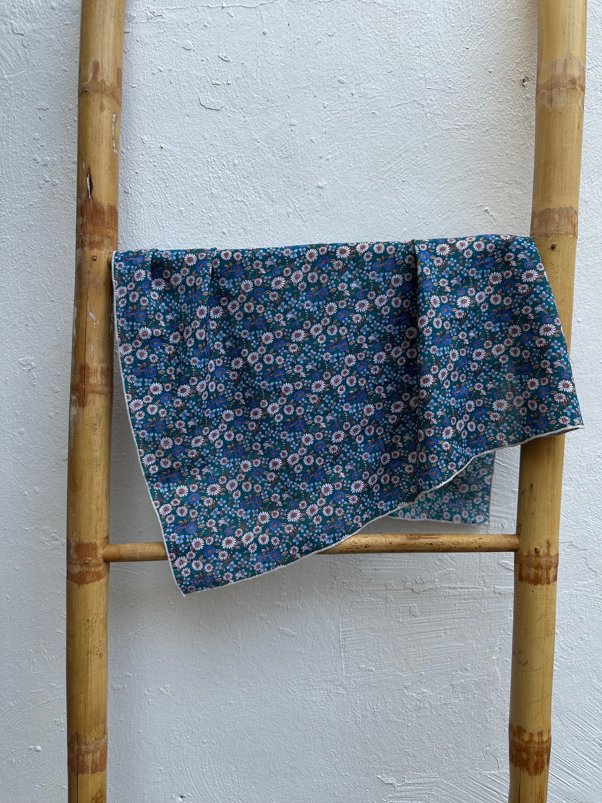 Este pañuelo presenta un fondo en un intenso verde oscuro, decorado con un estampado de flores blancas y colores suaves que crean un contraste armonioso y sofisticado. El borde blanco aporta un toque de frescura y equilibrio, rematando la pieza con elegancia. Fabricado en un tejido ligero y suave, es ideal para llevar al cuello, en el cabello o como accesorio en el bolso. Un complemento versátil, clásico y lleno de encanto natural, perfecto para realzar cualquier look con personalidad.
