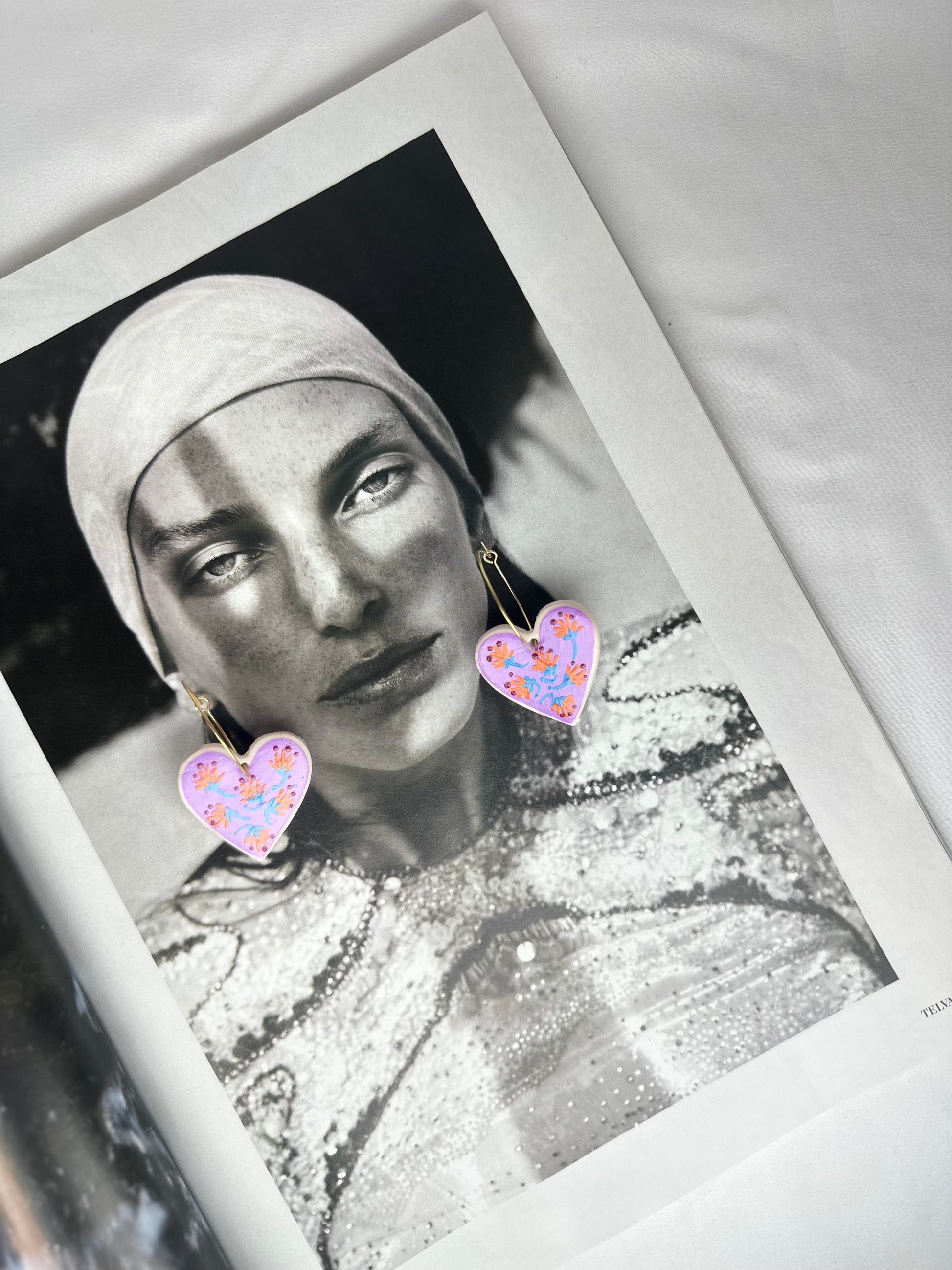 Pendientes Aro Dorado con Corazón Blanco Fondo Morado Flor Naranja Arcilla Polimérica