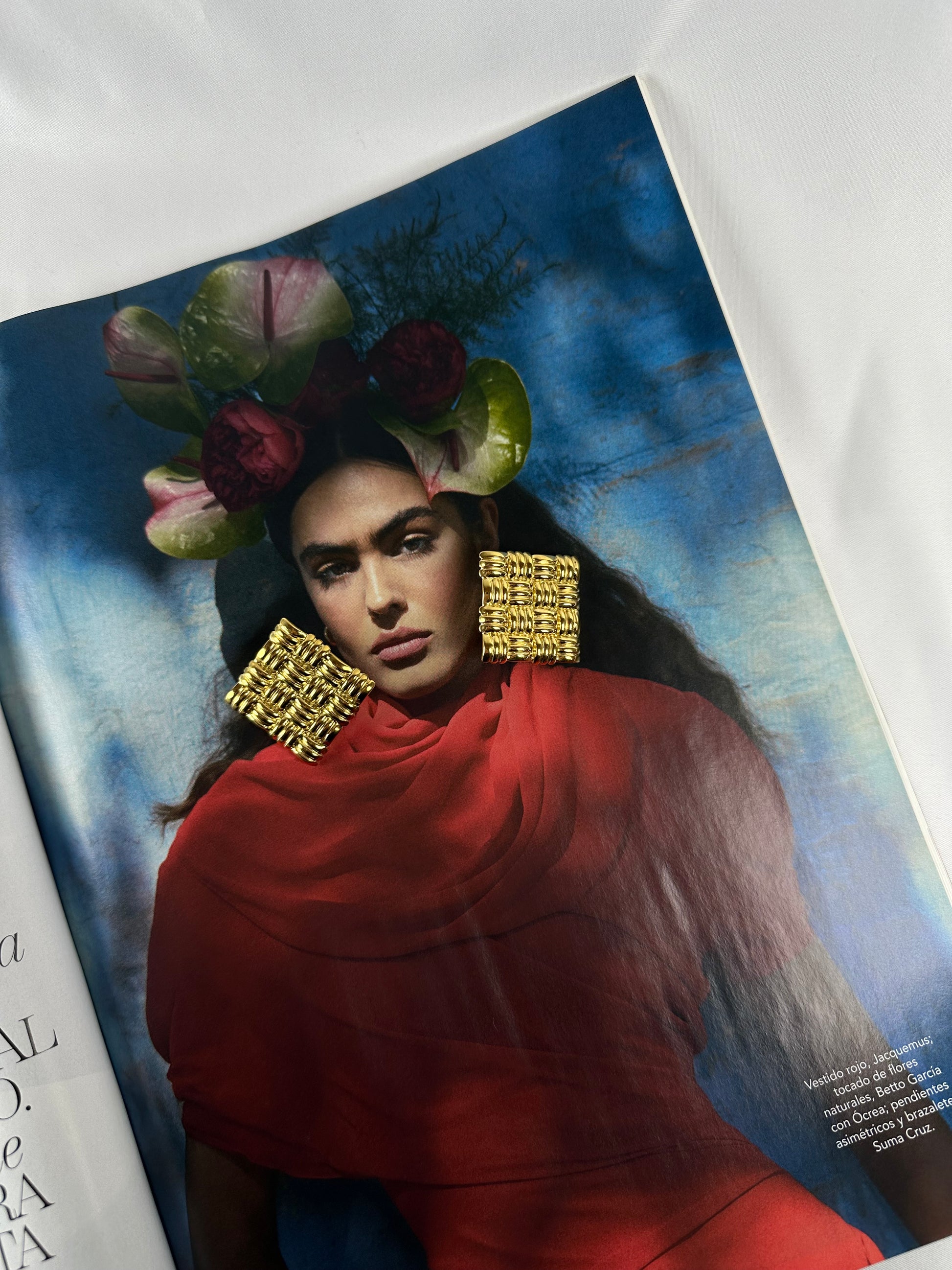 Pendiente original de diseño cuadrado y textura tejida que evoca la estética vintage. Complemento perfecto para quienes buscan accesorios con carácter en su joyería diaria.