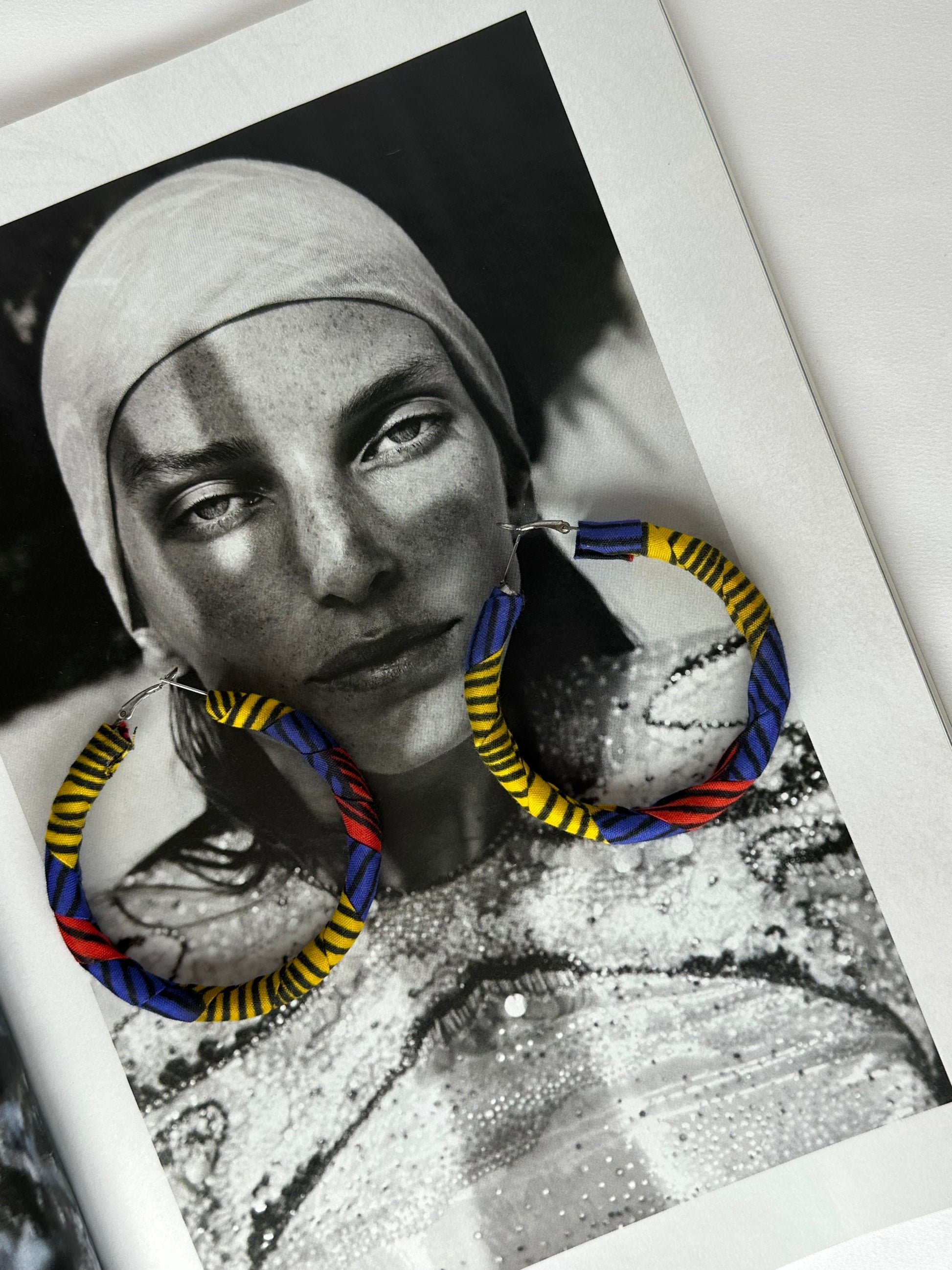 Pendiente Tela Wax Africana Redondo Mostaza y Azul y Rojo