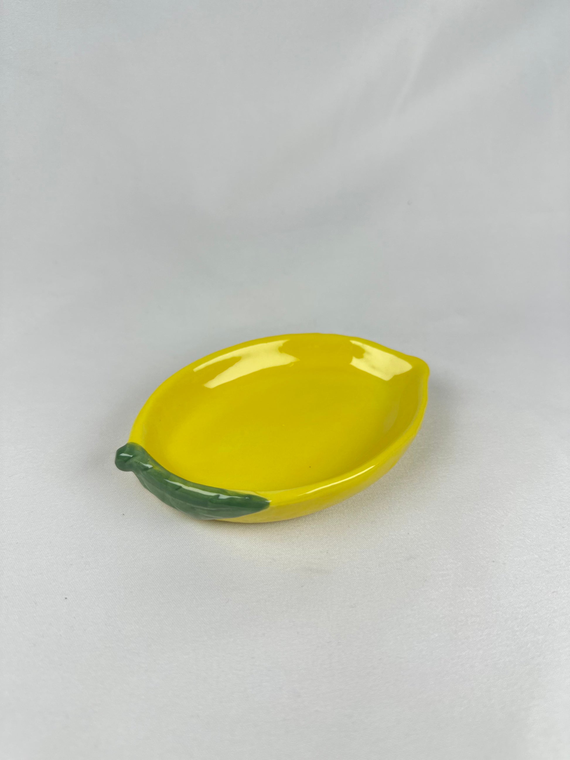 Dale un aire mediterráneo a tu mesa con este plato pequeño en forma de limón, ideal para servir salsas simplemente para decorar con alegría y color. Su diseño realista y esmaltado brillante lo convierte en una pieza tan funcional como decorativa.