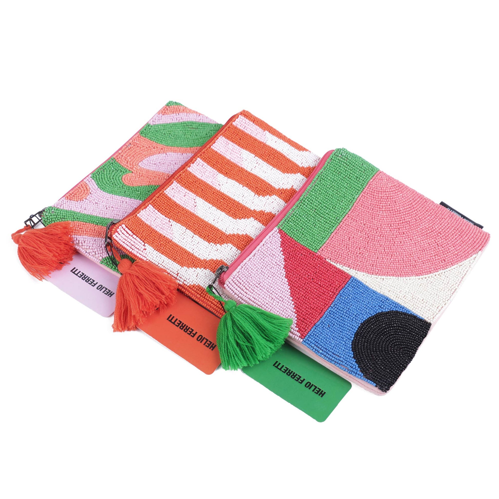 Cartera grande elaborada con pequeñas cuentas cosidas que forman un vibrante patrón psicodélico multicolor. Su diseño original y lleno de personalidad la convierte en un complemento ideal para quienes aman los detalles únicos. Cuenta con cremallera de cierre rematada con una borla decorativa, que facilita la apertura y añade un toque bohemio y elegante.