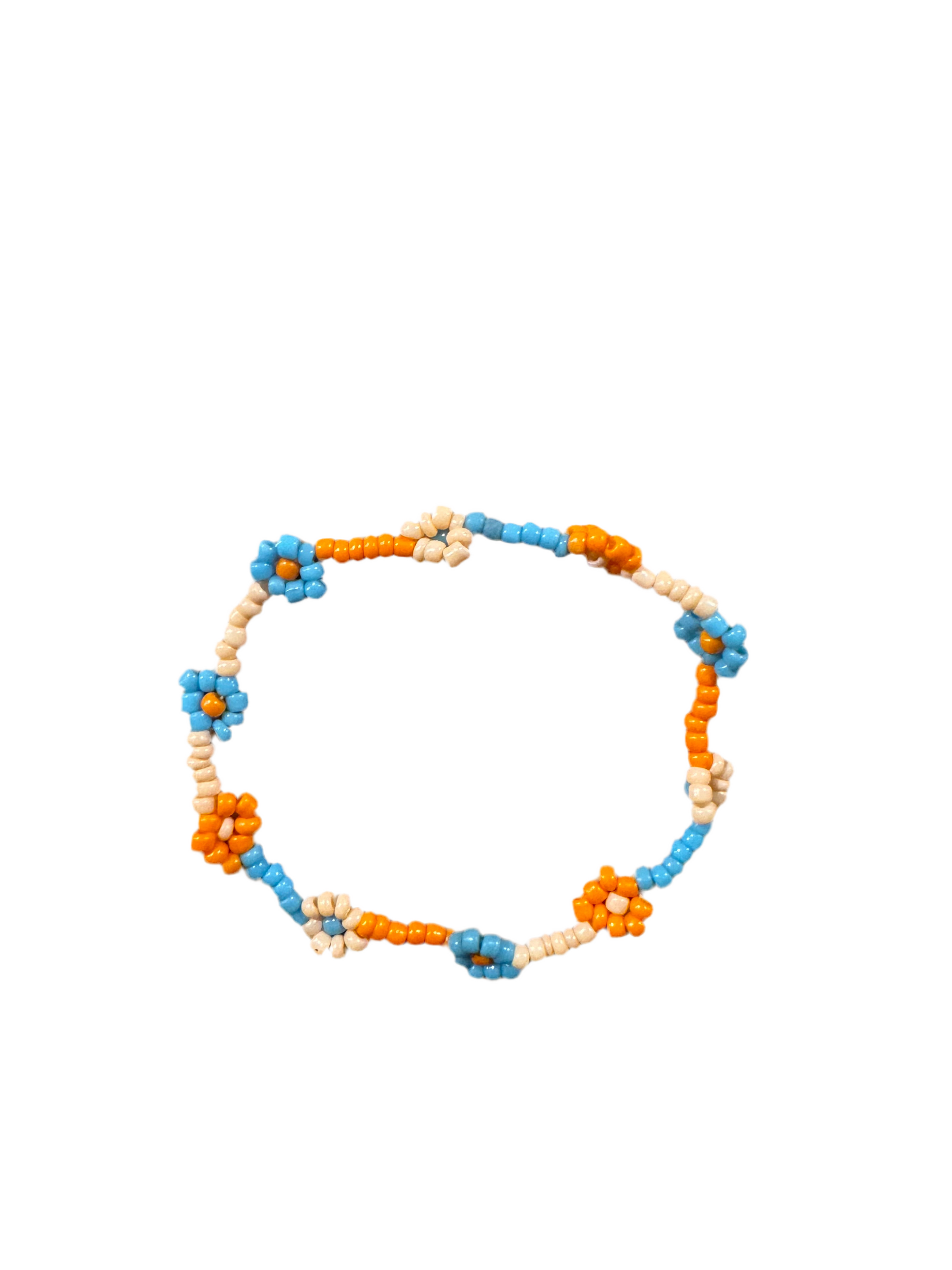 Pulsera Cuentas Bolitas Rosa y Naranja con Flores Margarita Naranja y Azul
