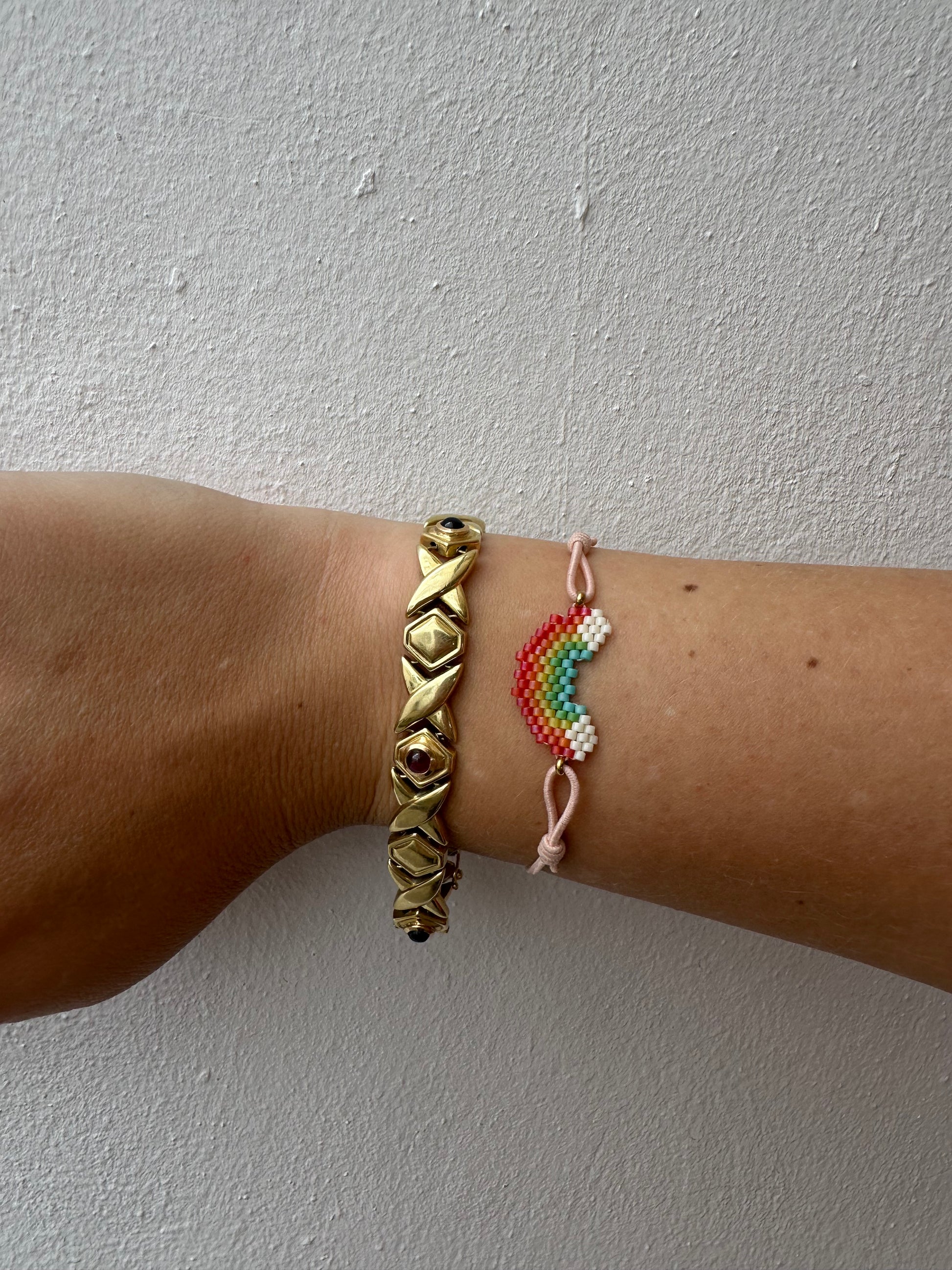 Esta pulsera elástica con cuentas Miyuki y diseño de arco iris es una explosión de alegría en forma de accesorio. Confeccionada a mano con delicadeza, celebra la diversidad, la esperanza y la magia de los pequeños detalles.