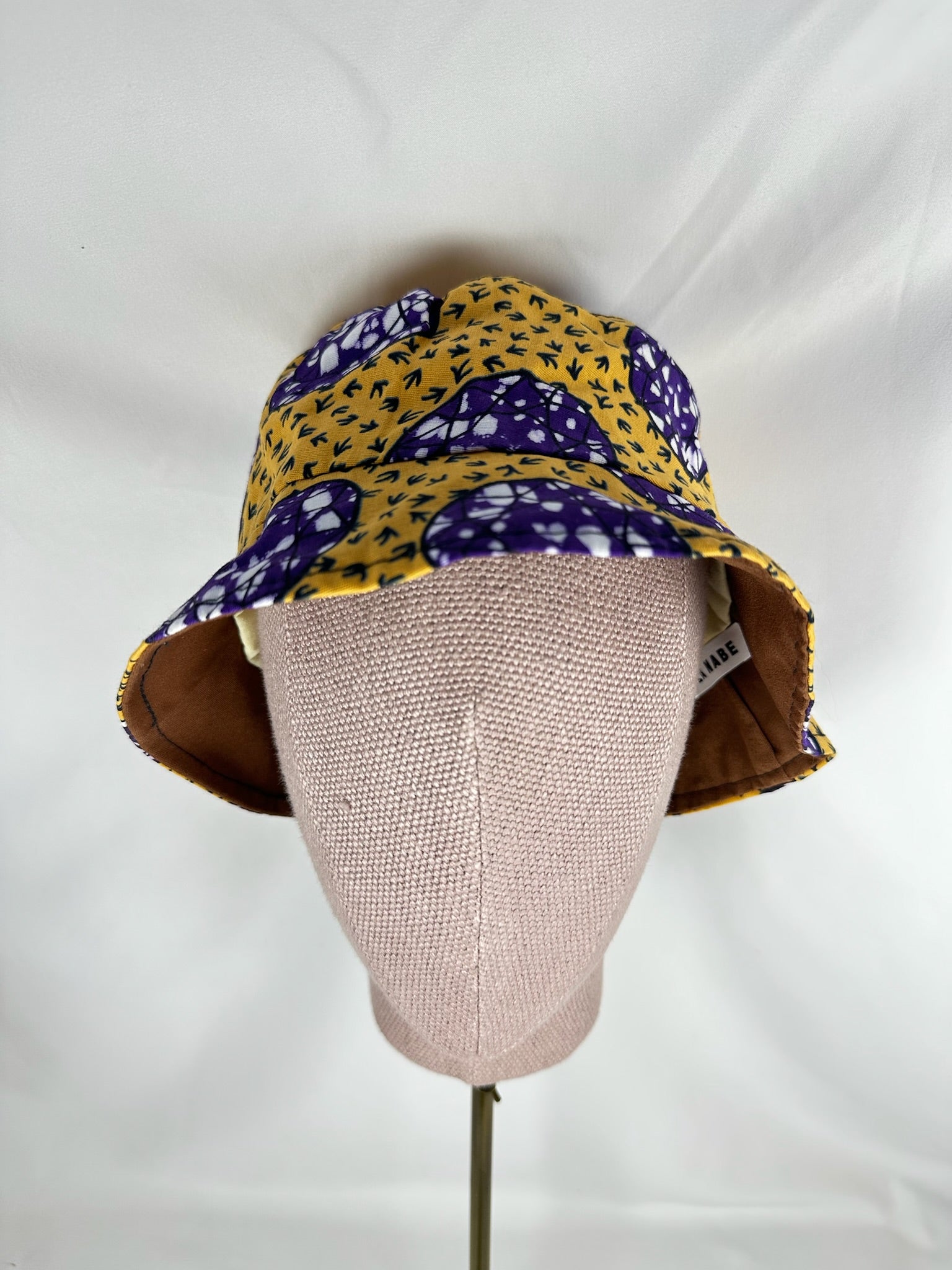 Sombrero elaborado en tela wax africana con fondo amarillo mostaza y un llamativo círculo morado que aporta contraste y mucha fuerza visual. Perfecto para looks veraniegos, urbanos o boho, es un accesorio que destaca y transforma cualquier outfit al instante.