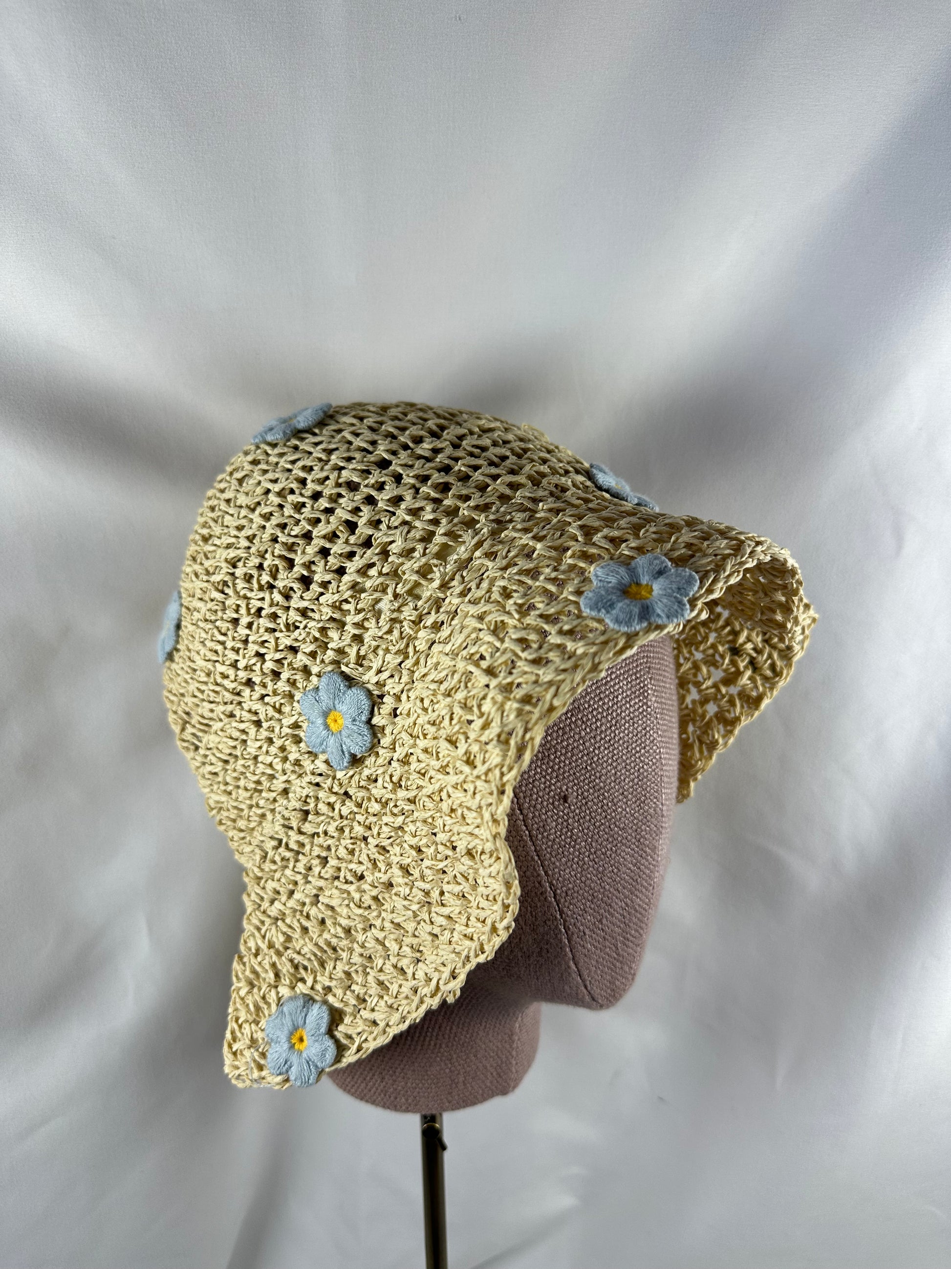 Sombrero Yute Claro Flor Flores Margarita Azul Claro y Amarillo