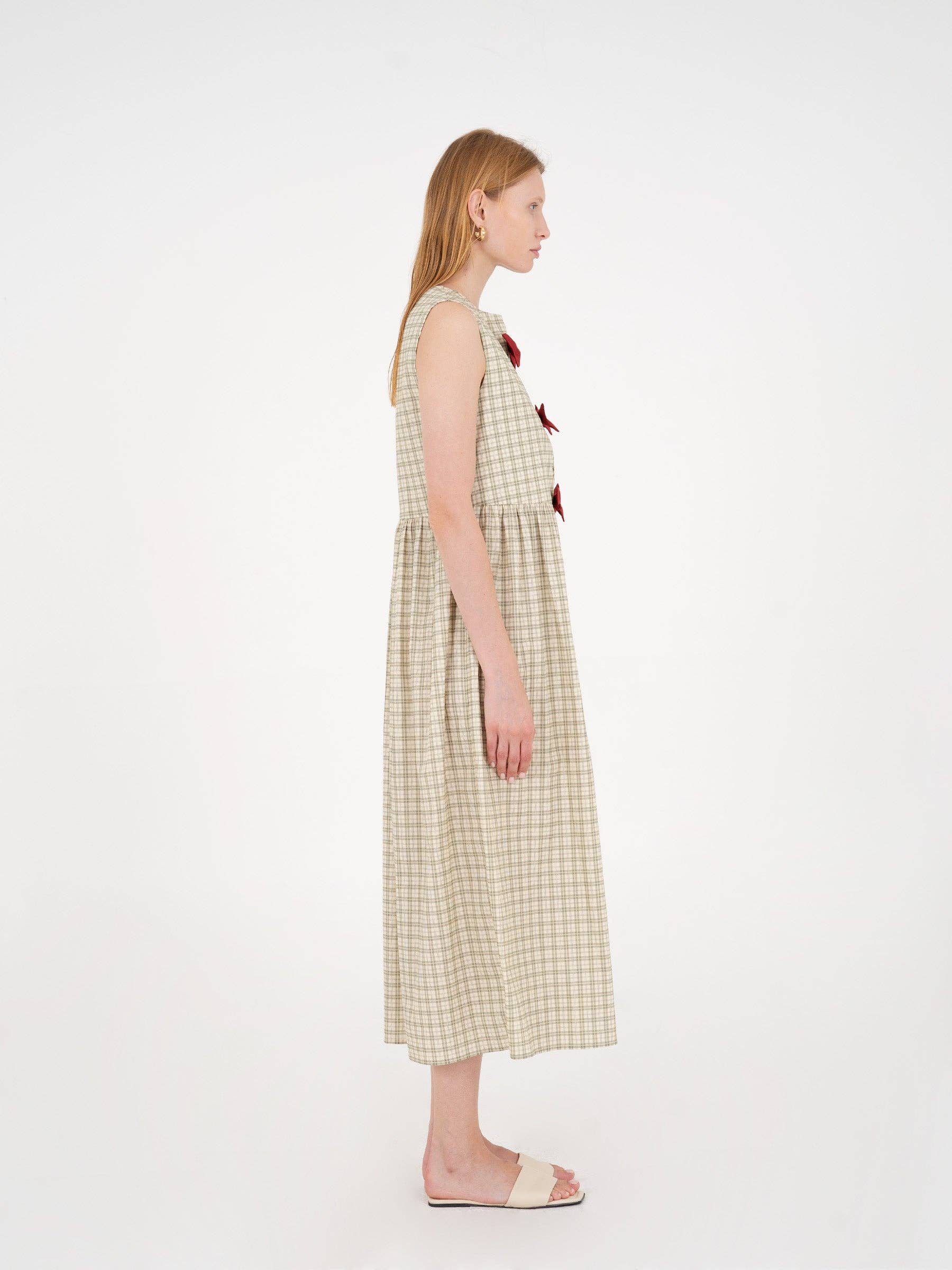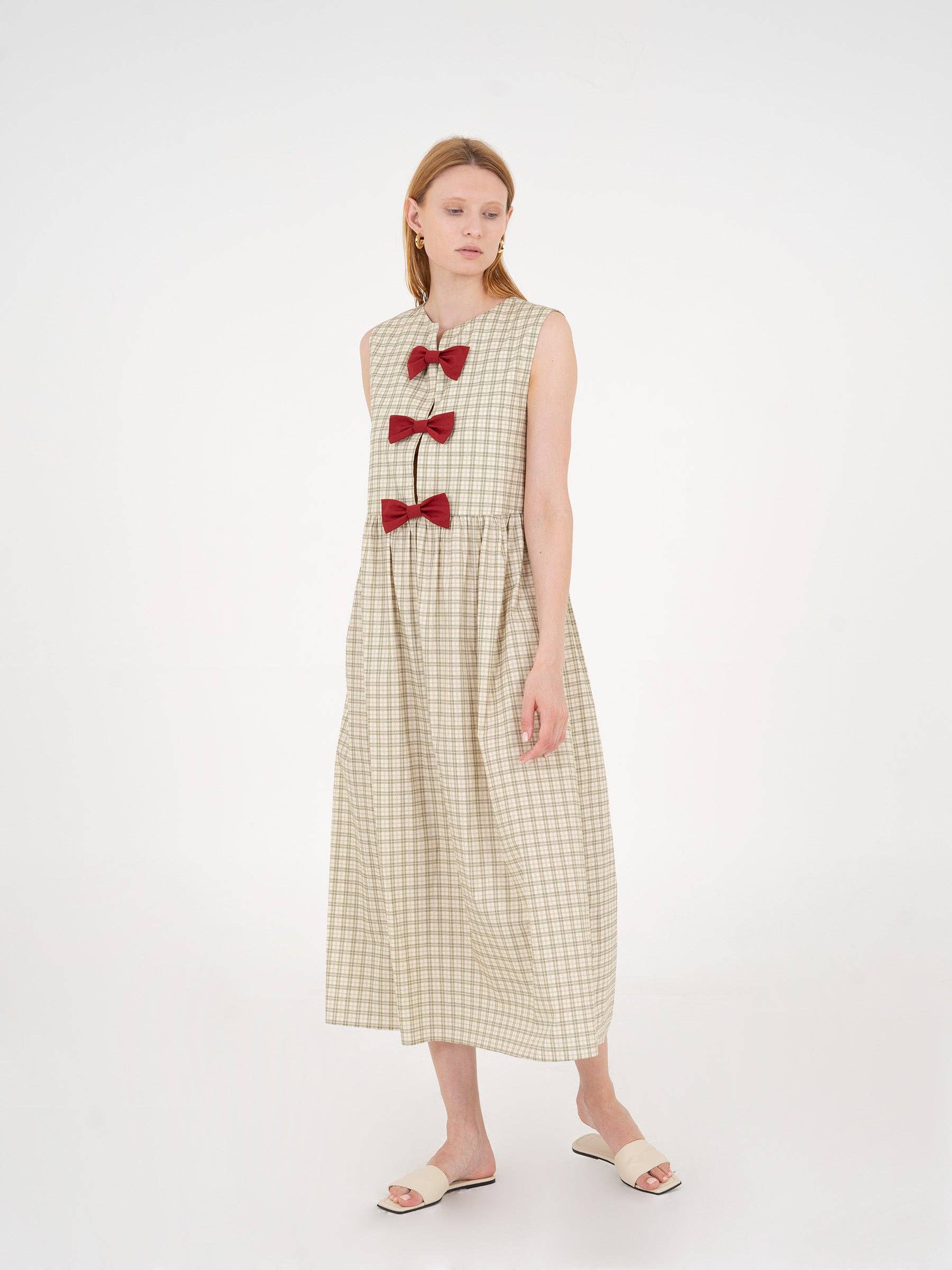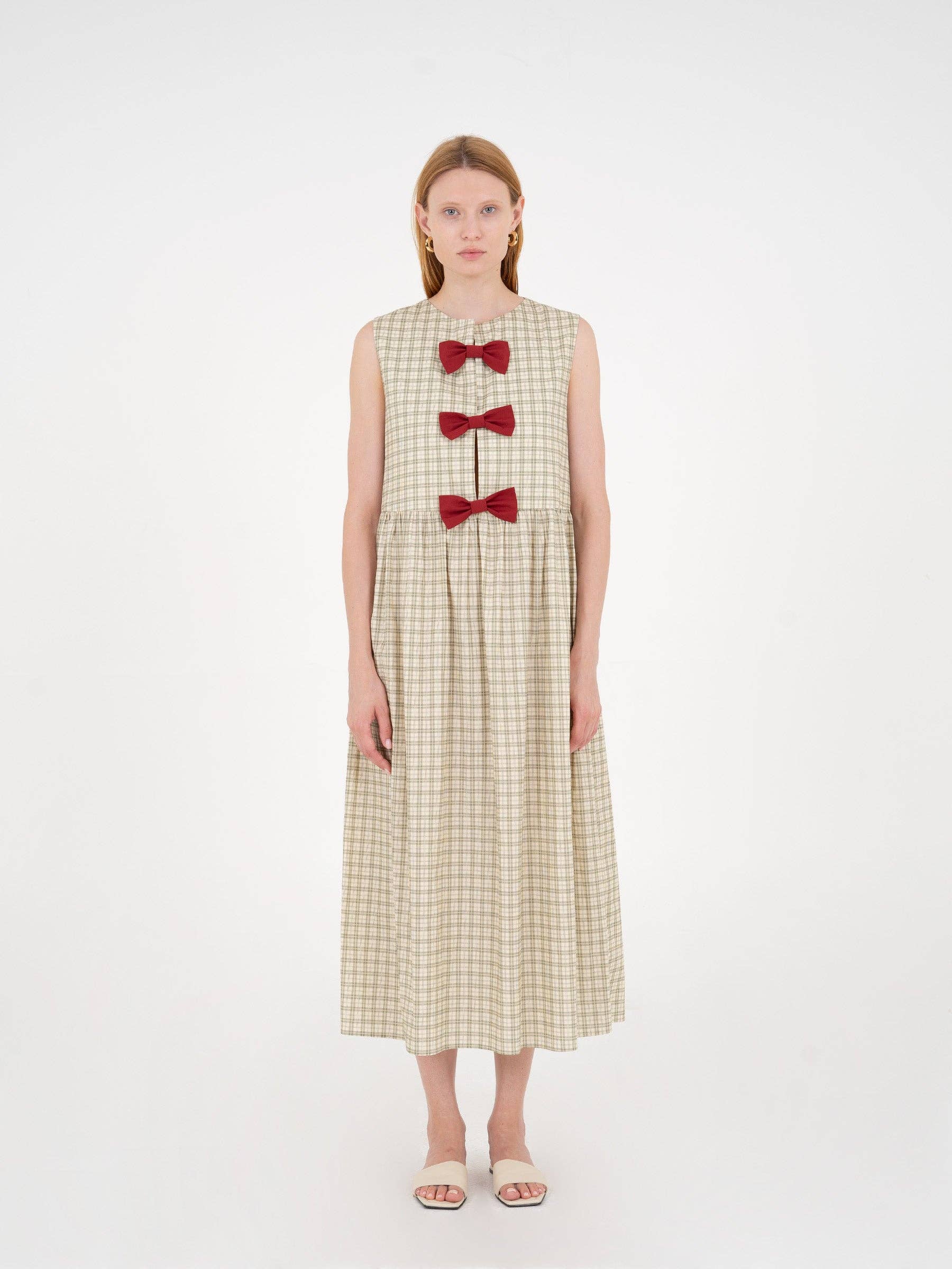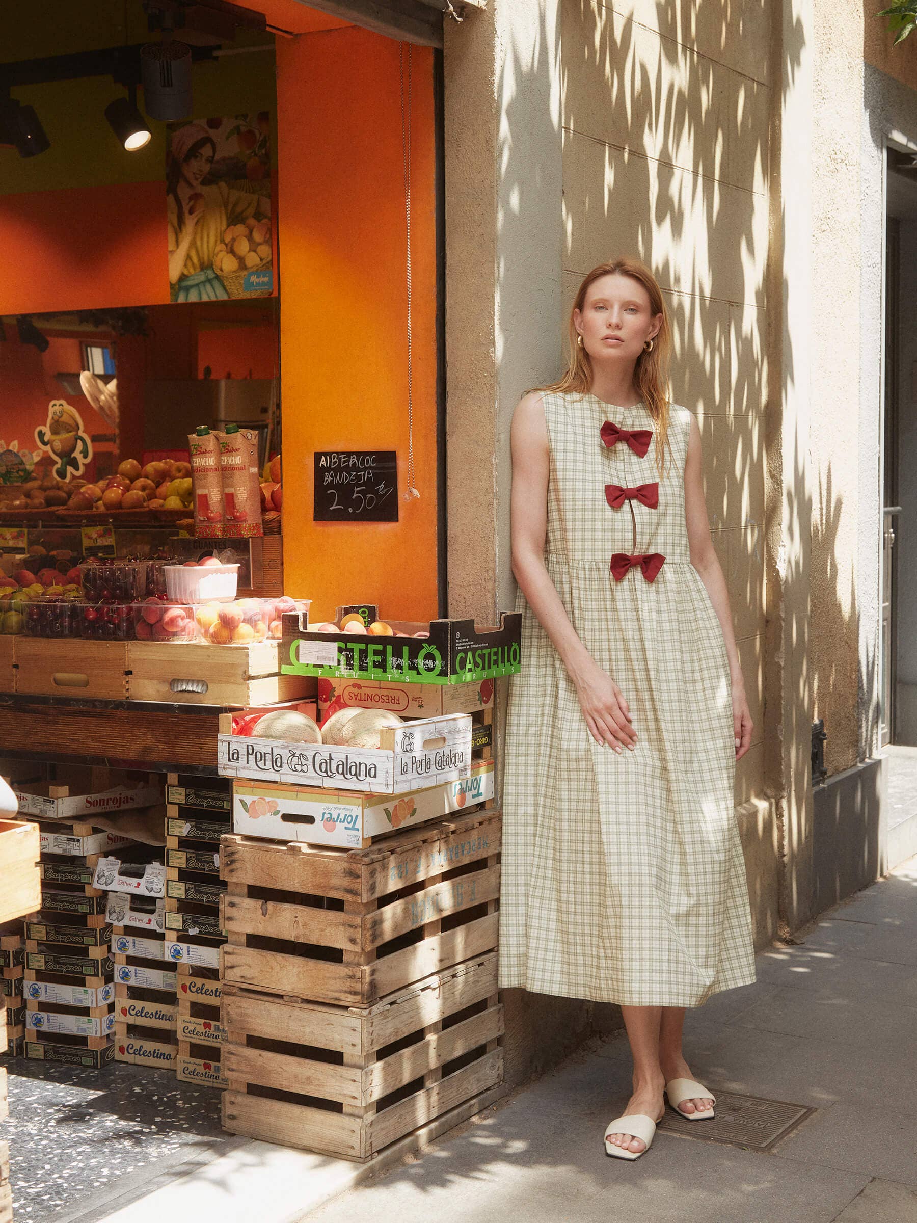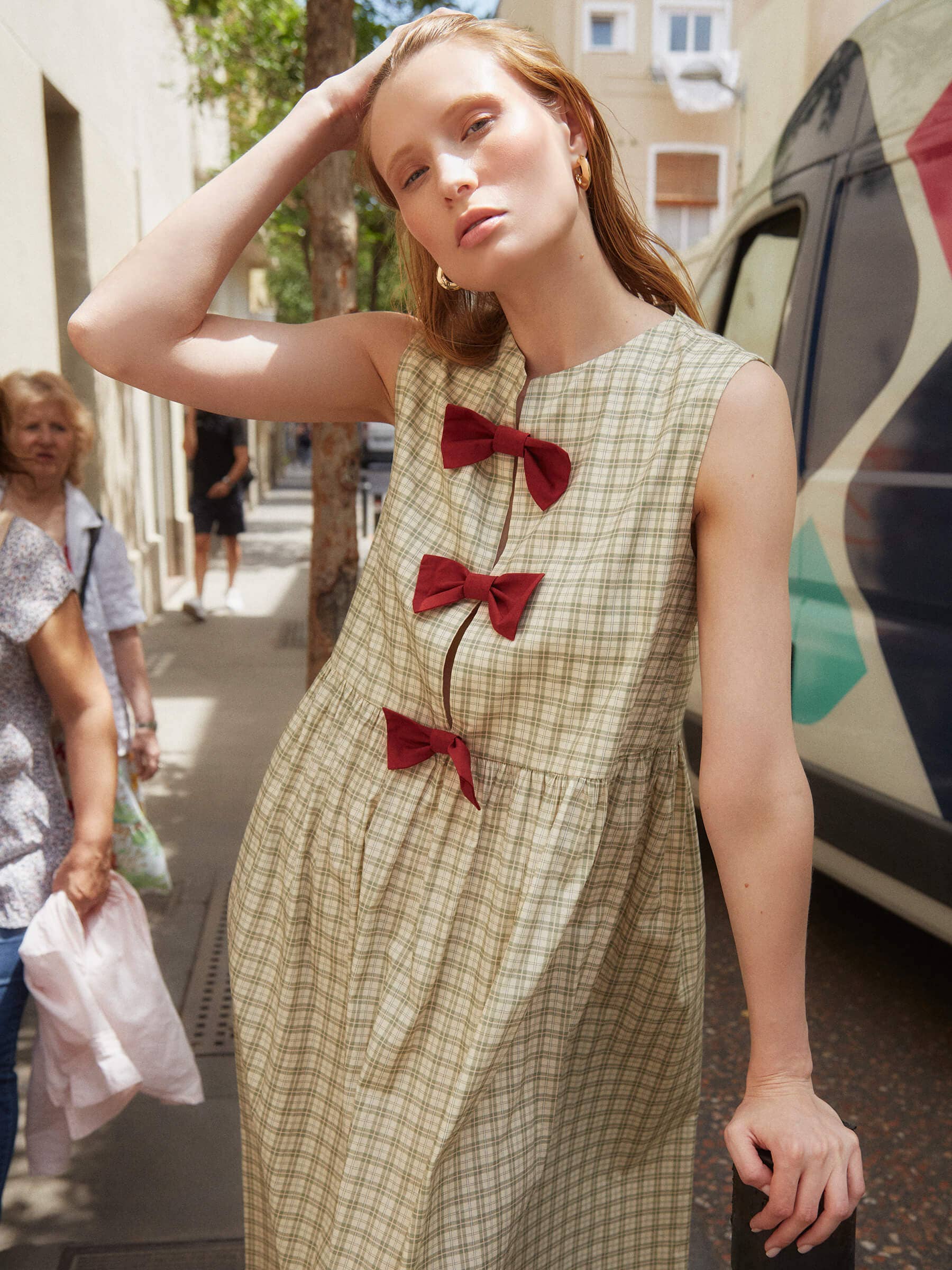 Este vestido combina el clásico estampado de cuadros con delicados lazos granates delante que le aportan un aire romántico y sofisticado. Confeccionado en un tejido ligero y cómodo, es perfecto para el día a día o para ocasiones especiales donde quieras destacar con un estilo femenino y encantador.